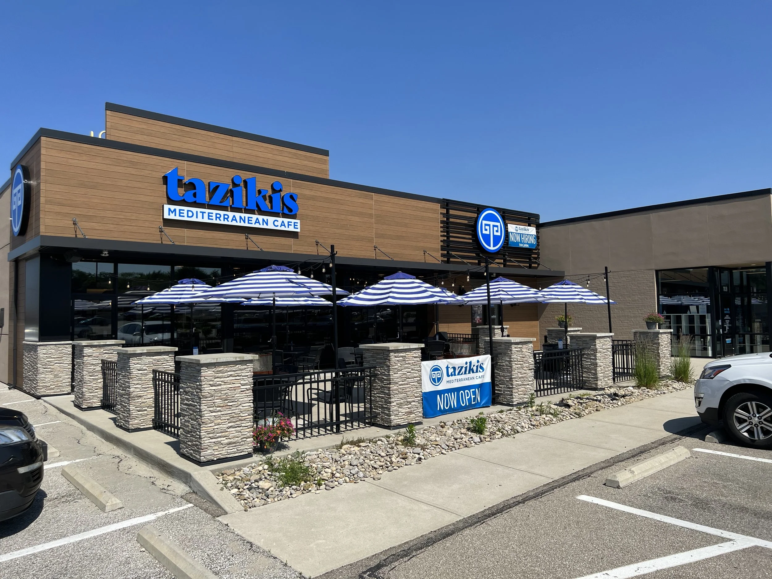 Our newest location is warm and inviting from the moment you walk in. Beautiful Coastal Mediterranean colors and dΓ©cor can be found from the large outdoor patio with fire pits all the way through the bright interior. The front wall features full size garage doors that can be lifted to bring the outside in and connect the patio with the dining room. Convenient curbside parking spots or a to-go shelf inside make for quick options to pick-up lunch or dinner in a hurry.